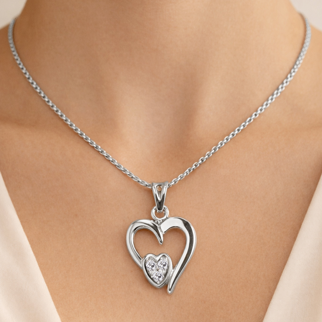 Designed in lustrous palladium, this necklace showcases a delicate Valentine heart-inspired pendant set with shimmering diamonds, capturing romance, elegance, and contemporary refinement.